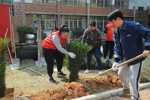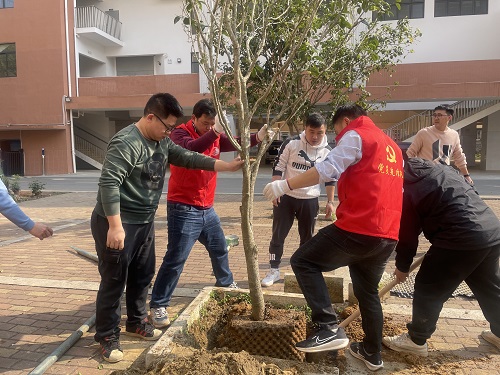 活動中,基礎(chǔ)分公司黨員志愿者與銀山小學(xué)教職工熱情高漲,分工協(xié)作,有的松土挖坑、有的扶苗填土、有的澆水育苗,現(xiàn)場一派熱火朝天的忙碌景象。在大家的共同努力下,本次活動共種植山茶花、鐵樹、桂花樹等樹苗60多棵。