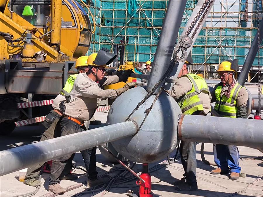 項目總建筑面積4.46萬平方米,建設(shè)內(nèi)容為文化會展中心和英德茶文化博物館(含紅茶研發(fā)中心、檢測中心和交易中心)等。目前,項目正在進行網(wǎng)架拼裝、加焊、焊接囗打磨、鋼球刷漆等工作,鋼結(jié)構(gòu)施工進度為65%。