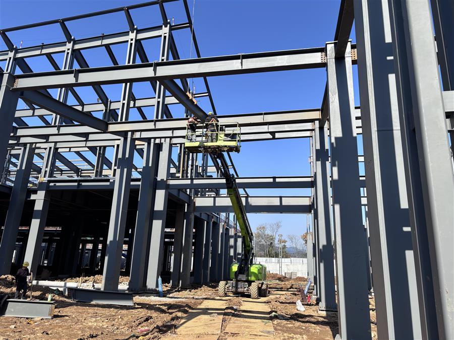 項(xiàng)目施工現(xiàn)場,機(jī)器轟鳴,工程車輛來回穿梭,工人們在各點(diǎn)位開展墊層、樓承板澆筑、鋼筋綁扎、栓釘焊接、基礎(chǔ)砌磚、屋面底板和鋼結(jié)構(gòu)梁柱安裝等施工作業(yè),處處涌現(xiàn)“冬忙”景象。