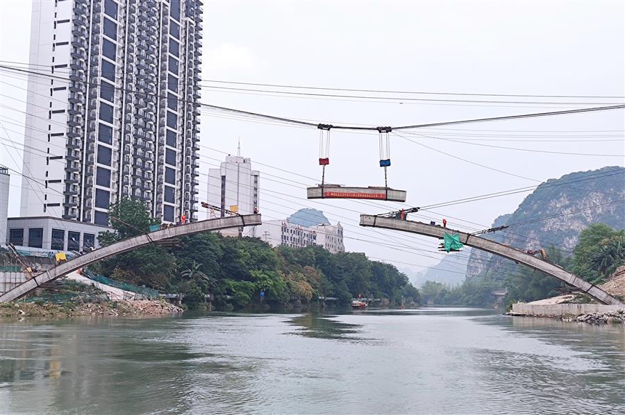8:28分,隨著現(xiàn)場指揮員一聲口令,首條拱肋最后一節(jié)砼拱箱被纜索吊緩緩吊起,向橫跨在龍江河上的主拱圈移動。25分鐘后,第七片拱箱精準(zhǔn)吊裝就位,河池市龍江六橋(輝樂橋)首條拱肋順利合攏。