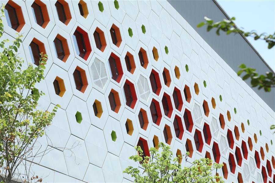 項(xiàng)目建筑外立面設(shè)計將柳州本土文化元素“紫荊花”與康恒公司“蜂巢”理念完美融合,多層次的幕墻肌理協(xié)同自然光線,在不同照射條件下呈現(xiàn)出多樣的光影效果,不僅呼應(yīng)了垃圾焚燒發(fā)電精細(xì)的工藝流程,更體現(xiàn)了人與自然和諧共生的美好愿景。