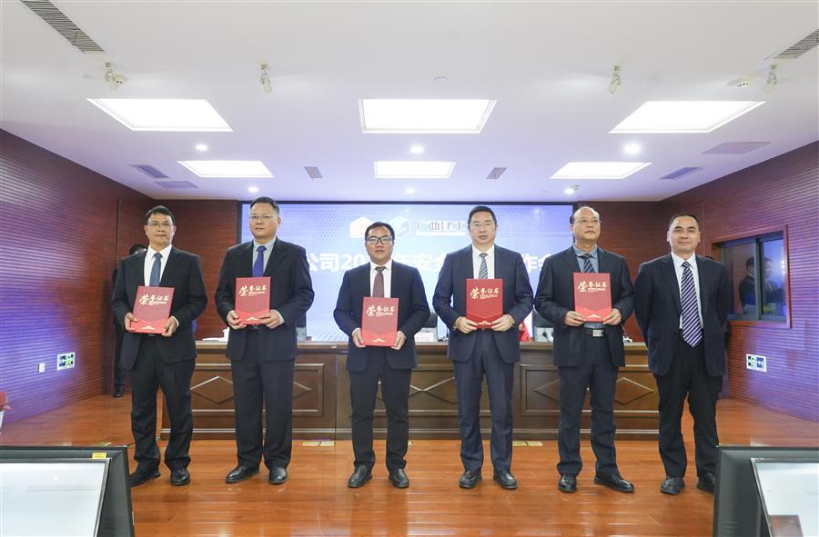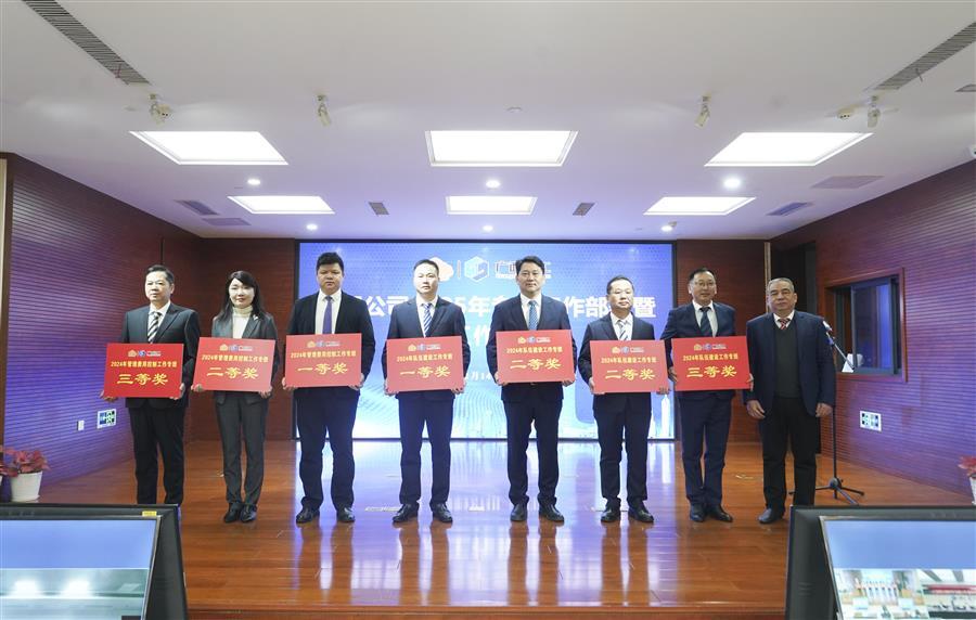 公司董事長(zhǎng)、黨委書(shū)記覃振華(右三)上臺(tái)領(lǐng)取2024年隊(duì)伍建設(shè)工作專班獎(jiǎng),公司總經(jīng)理、黨委副書(shū)記蒙勝益(左一)上臺(tái)領(lǐng)取2024年管理費(fèi)用控制工作專班獎(jiǎng)