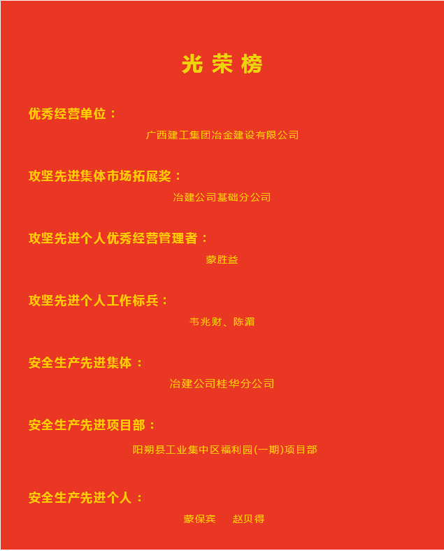2 月 14 日,廣西建工集團(tuán)有限責(zé)任公司 2025 年專班工作部署暨重點(diǎn)工作推進(jìn)會(huì)、安全生產(chǎn)工作會(huì)、黨建工作會(huì)等系列會(huì)議在南寧召開(kāi)。會(huì)議表彰了2024年度先進(jìn)集體和先進(jìn)個(gè)人,冶建公司榮獲多項(xiàng)集體和個(gè)人榮譽(yù)。