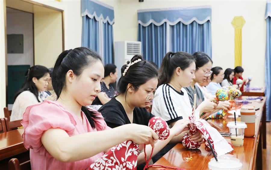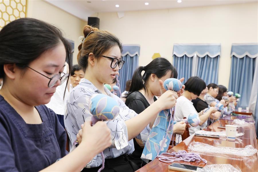 課堂上,培訓(xùn)老師王春梅為大家詳細(xì)講解了艾草養(yǎng)生錘的功效和用途,并演示了其制作方法和步驟。“將錘柄插入艾草包,拉緊艾草包,然后將其放在布料三分之一處,捏成一個(gè)緊實(shí)的圓球……”在王老師的指導(dǎo)下,女職工們積極參與,跟著老師的指導(dǎo)一步一步地制作自己的養(yǎng)生艾草錘。大家認(rèn)真細(xì)致的聽講并按步驟制作,不久一把把色彩鮮艷、質(zhì)量上乘的艾草養(yǎng)生錘相繼“出爐”。大家互相試用,現(xiàn)場(chǎng)洋溢著歡聲笑語。